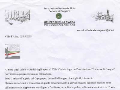 Lettera di ringraziamento Gruppo Alpini di Villa d’Adda (BG)